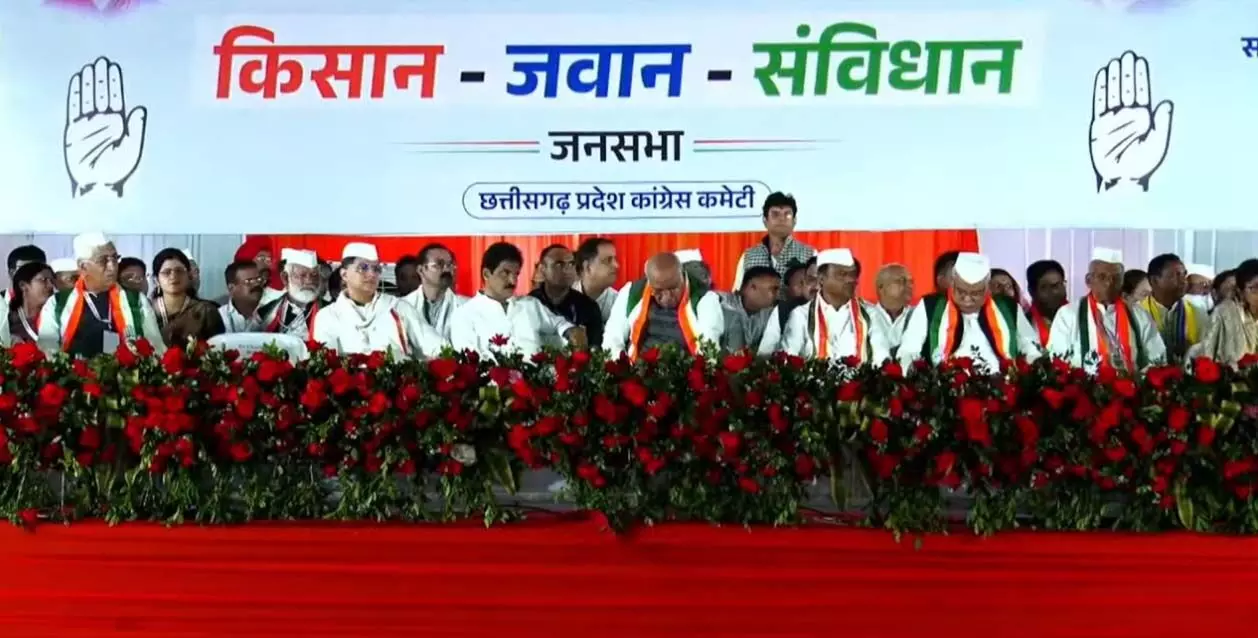 रायपुर। कांग्रेस नेता मल्लिकार्जुन खड़गे ने रायपुर में किसान, जवान, संविधान सभा को संबोधित किया। कार्यक्रम के मंच में छत्तीसगढ़ सह-प्रभारी जरिता लैतफलांग, पूर्व पीसीसी चीफ मोहन मरकाम, प्रेम साय सिंह टेकाम सहित कई वरिष्ठ नेता मौजूद हैं। इससे पहले एयरपोर्ट पहुंचने पर कांग्रेसियों ने उनका भव्य स्वागत किया।