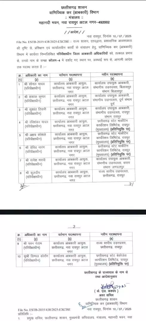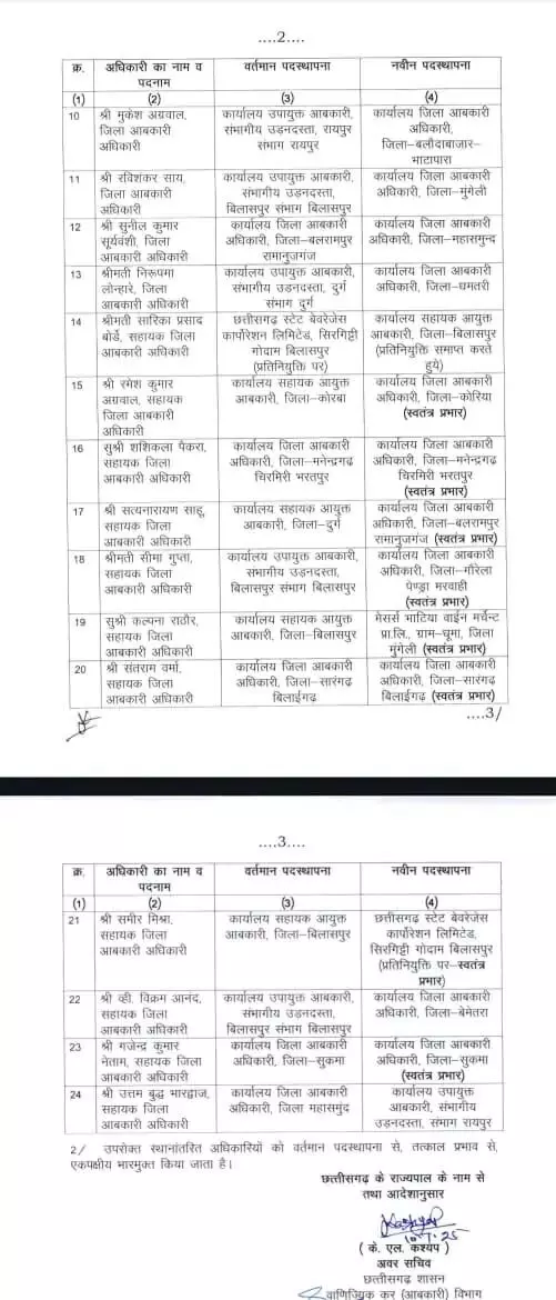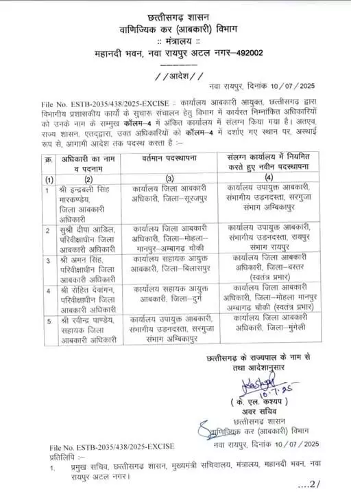 रायपुर। निलंबन की कार्रवाई के बाद आबकारी विभाग ने 39 आबकारी अधिकारियों का तबादला किया है। आधे से ज्यादा जिलों के अधिकारियों को एक जिले से दूसरे जिले में भेज दिया गया है। हालांकि आदेश में प्रशासनिक आधार पर सर्जरी करना बताया गया है। वाणिज्यिक कर विभाग ने नवा रायपुर ने आदेश जारी किया है।