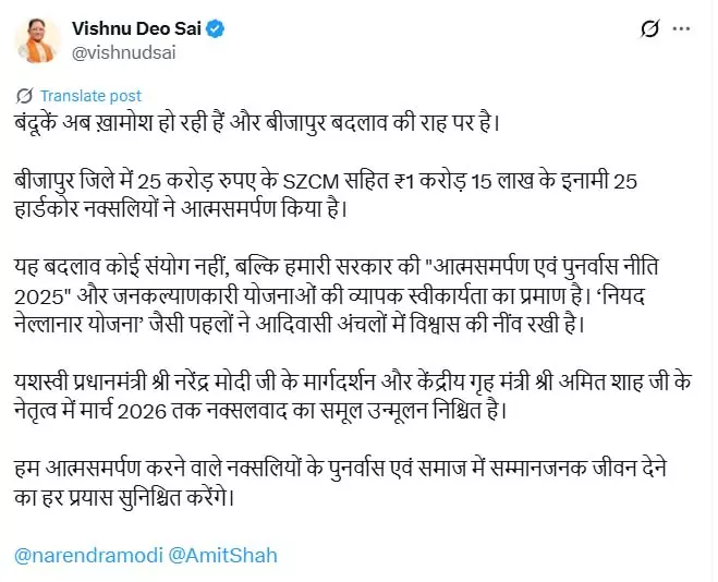 सीएम ने इस अवसर पर आत्मसमर्पण करने वाले नक्सलियों के पुनर्वास के प्रति राज्य सरकार की प्रतिबद्धता जताते हुए कहा, “हम यह सुनिश्चित करेंगे कि समाज की मुख्यधारा में लौटे लोग सम्मानजनक जीवन जी सकें।” उन्होंने कहा कि राज्य सरकार उन्हें शिक्षा, स्वरोजगार, स्वास्थ्य और सामाजिक सुरक्षा की सुविधाएं उपलब्ध कराएगी। मुख्यमंत्री साय ने प्रधानमंत्री नरेंद्र मोदी और केंद्रीय गृह मंत्री अमित शाह का आभार व्यक्त करते हुए कहा कि उनके मार्गदर्शन में मार्च 2026 तक नक्सलवाद का समूल उन्मूलन सुनिश्चित किया जाएगा। बीजापुर में हुआ यह सामूहिक आत्मसमर्पण नक्सल प्रभावित क्षेत्रों में सरकार के प्रयासों की एक बड़ी सफलता के रूप में देखा जा रहा है। यह आने वाले समय में और अधिक नक्सलियों को हथियार छोड़ने के लिए प्रेरित कर सकता है।