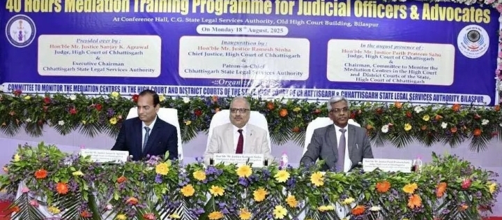 Bilaspur. बिलासपुर। छत्तीसगढ़ राज्य विधिक सेवा प्राधिकरण में सोमवार को न्यायिक अधिकारियों और अधिवक्ताओं के लिए आयोजित 40 घंटे के व्यापक मध्यस्थता प्रशिक्षण कार्यक्रम का शुभारंभ रमेश सिन्हा, मुख्य न्यायाधिपति, छत्तीसगढ़ उच्च न्यायालय एवं मुख्य संरक्षक, राज्य विधिक सेवा प्राधिकरण ने किया। इस अवसर पर न्यायमूर्ति संजय के अग्रवाल, न्यायाधीश, छत्तीसगढ़ उच्च न्यायालय एवं कार्यपालक अध्यक्ष, राज्य विधिक सेवा प्राधिकरण तथा न्यायमूर्ति पार्थ प्रतीम साहू, न्यायाधीश, छत्तीसगढ़ उच्च