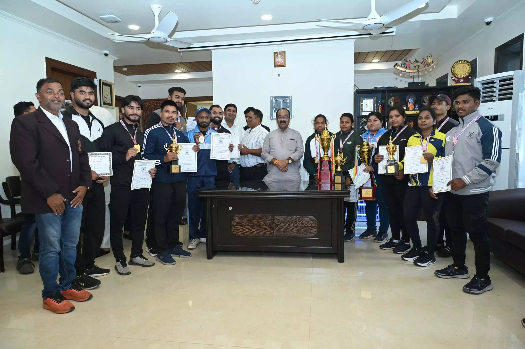 आज अटल नगर, नवा रायपुर शासकीय निवास कार्यालय में पावरलिफ्टिंग के खिलाड़ियों ने कोच के साथ सौजन्य मुलाकात की।… pic.twitter.com/VYQHQ7PKkd