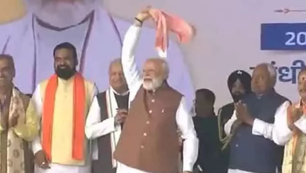 नीतीश कुमार के शपथ लेने के बाद, प्रधानमंत्री मोदी ने ‘गमछा’ (पतला शॉल) लहराकर बिहार के लोगों का शुक्रिया अदा किया।