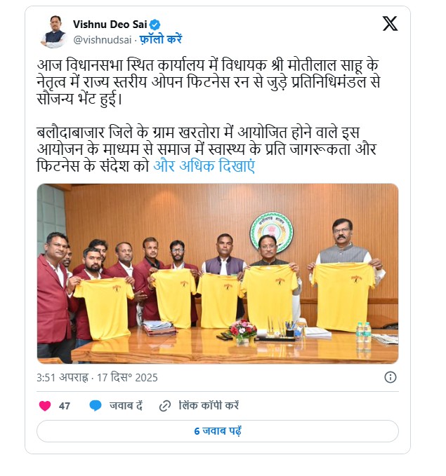 रायपुर। राज्य स्तरीय ओपन फिटनेस रन से जुड़े प्रतिनिधिमंडल ने सीएम साय से मुलाकात की। बलौदाबाजार जिले के ग्राम खरतोरा में आयोजित होने वाले इस आयोजन के माध्यम से समाज में स्वास्थ्य के प्रति जागरूकता और फिटनेस के संदेश को जन-जन तक पहुँचाने का सराहनीय प्रयास किया जा रहा है।