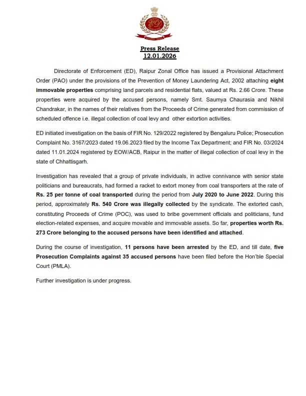 रायपुर। प्रवर्तन निदेशालय (ED), रायपुर जोनल कार्यालय ने प्रिवेंशन ऑफ मनी लॉन्ड्रिंग एक्ट (PMLA), 2002 के तहत बड़ी कार्रवाई करते हुए छत्तीसगढ़ में कोयला लेवी की अवैध वसूली मामले से जुड़ी संपत्तियों को अटैच किया है।