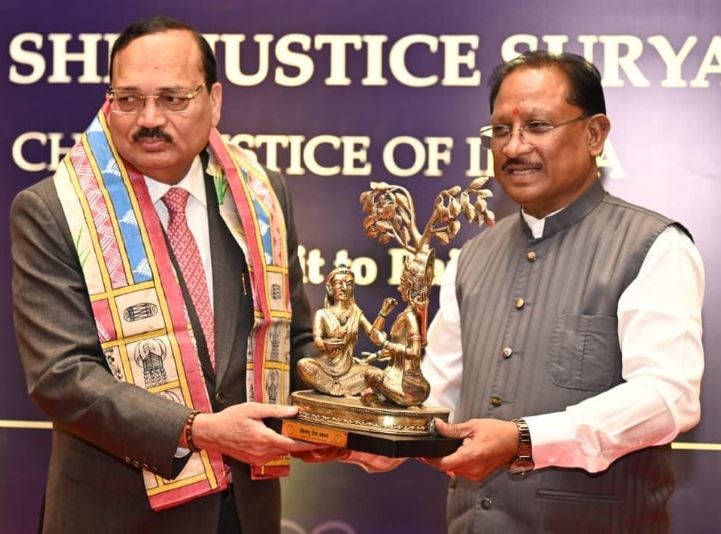 मुख्यमंत्री श्री विष्णु देव साय ने भारत के माननीय मुख्य न्यायाधीश न्यायमूर्ति श्री सूर्यकांत के छत्तीसगढ़ आगमन पर पुष्प गुच्छ भेंटकर उनका आत्मीय स्वागत एवं अभिनंदन किया। इस अवसर पर मुख्यमंत्री श्री साय ने माननीय मुख्य न्यायाधीश को छत्तीसगढ़ की समृद्ध सांस्कृतिक परंपरा के प्रतीक स्वरूप राजकीय गमछा, विश्वविख्यात बस्तर दशहरा पर आधारित कॉफी टेबल बुक तथा बेल मेटल से निर्मित भगवान श्रीराम एवं माता शबरी की आकर्षक प्रतिकृति भेंट की।