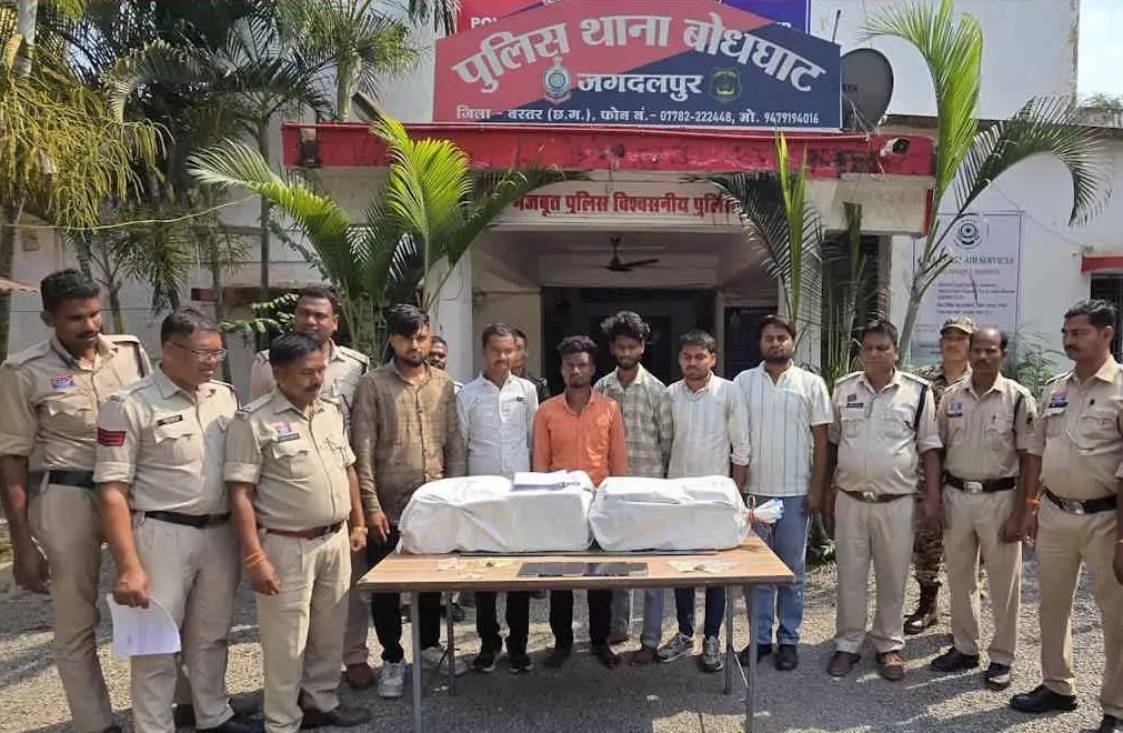 जगदलपुर: बस्तर पुलिस ने एक बड़े अंतरराज्यीय गांजा तस्कर गिरोह का भंडाफोड़ करते हुए 6 सदस्यों को गिरफ्तार किया है. गोयल धर्मशाला में रुके हुए आरोपियों के कब्जे से 54 किलोग्राम गांजा बरामद किया गया है, जिसका मूल्य 26 लाख 97 हजार रुपए बताया गया है. मुखबिर से मिली सूचना पर बोधघाट थाने पुलिस ने गोयल धर्मशाला में दबिश दी. मौके से राजस्थान निवासी बबलू कुशवाहा, श्रीनिवास, देशराज कुशवाहा, उत्तर प्रदेश निवासी पंकज उपरेती, सुकमा निवासी राम सिंह और दुबराज कश्यप को गिरफ्तार किया.